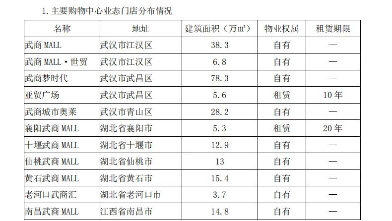 武商集团共有11座购物中心,总建筑面积约为227.4万平方米,其中10家位于湖北武汉、十堰、襄阳等地,1家是去年新开业的江西南昌武商MALL。