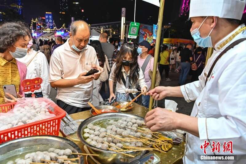 潮州作为第十四届“中国旅游日”倒计时活动承办城市之一,5月13日,倒计时首场活动在潮州古城镇海楼前广场举行。活动围绕“吃”主题,以“美食+文化+旅游”为主线,多元融合非遗、工艺美术等元素,不断擦亮“世界美食之都”的金字招牌。图为游客排队购买潮州牛肉丸。