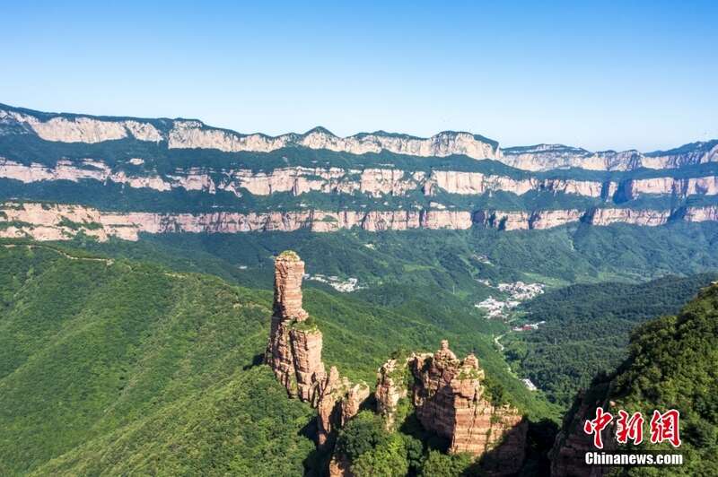 航拍嶂石岩九女峰景区。嶂石岩风景区属于太行山,山崖峭壁均为赤红色的砂岩,著名的嶂石岩地貌就因此而得名。九女峰景区位于内丘、临城、赞皇三县交界地带,因九座若仙女玉立的山峰而得名,景区内更因有险竣而著称的一米崖。壮观的红色砂石岩结构,突兀于青翠平缓的山顶险竣又秀美。