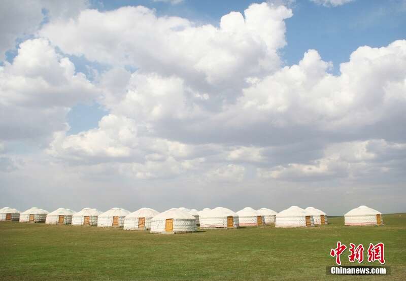 鄂尔多斯是中国最佳民族风情旅游城市。鄂尔多斯是国家森林城市、全国文明城市、中国优秀旅游城市。境内有成吉思汗陵、响沙湾、七星湖、康巴什旅游区、鄂尔多斯草原等景点。图为内蒙古鄂尔多斯草原旅游区蓝天白云下的蒙古包。
