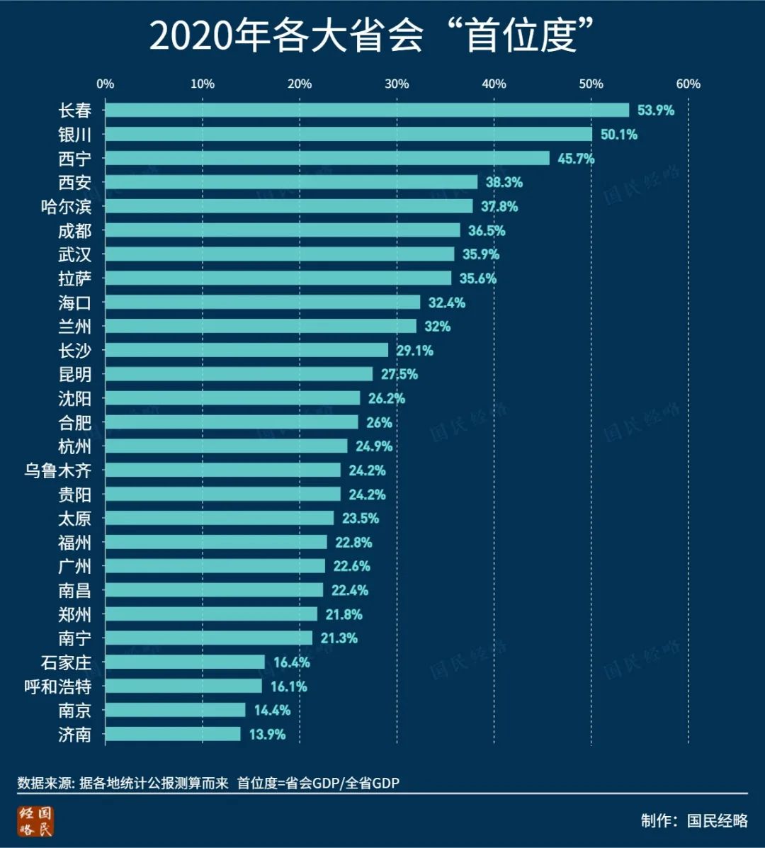 可以看出,省会首位度最高的城市,不是成都、武汉、西安等公认的强省会,而是长春、银川和西宁。