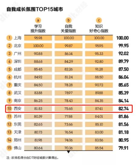 选择一座理想城市,找到志同道合、共同奋斗的伙伴,成为青年人选择的一个重要因素。当代青年的学习不止于书本阅读,知识付费以及在视频平台学习打卡也成为风潮,它们和传统的书店、图书馆分布数量以及线上图书消费规模构成学习提升指数。在自我成长氛围榜单内,西安列第10位。