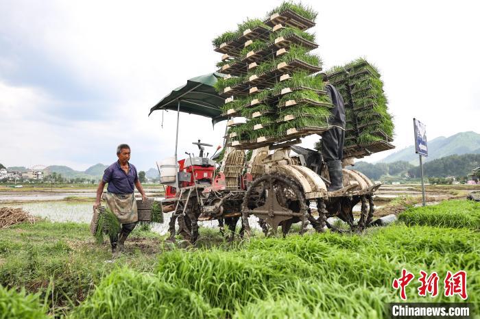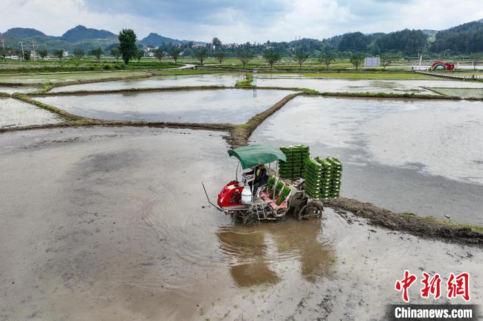 农户驾驶插秧机在盘江镇音寨坝区高标准农田插秧。 中新网记者瞿宏伦摄