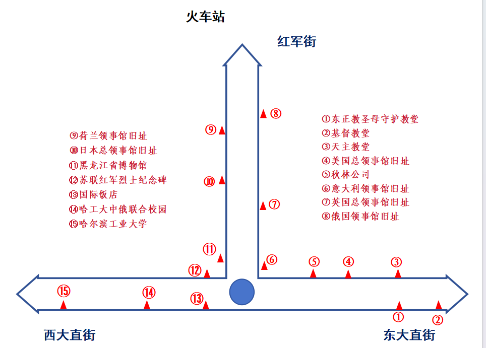 从位于东大直街与鞍山街交口的①东正教圣母守护教堂出发,其两侧的街对面分别是②基督教堂和③天主教堂,沿着天主教堂一侧向西出发,一路上经过④美国总领事馆旧址和⑤秋林公司,在圣尼古拉教堂遗址的路口右转到达博物馆广场,广场上米黄色的建筑就是修缮一新的⑥意大利领事馆旧址。沿着红军街一路向北,首先映入眼帘的是⑦英国总领事馆旧址,现在的米兰婚纱摄影。继续前进,直到看到五颜六色的雨搭,这里便是曾经的⑧俄国领事馆旧址,现在的龙门贵宾楼。站在这里向北望去,能看到有着“霍格沃兹站”之称的哈尔滨火车站。走到街对面,沿着红军街往回走,闻到阵阵咖啡香的时候,就到了⑨荷兰领事馆旧址,再前行几十米,便是⑩日本总领事馆旧址。继续前行到大直街路口处就是⑪黑龙江省博物馆,站在博物馆门前,可以看到不远处的⑫苏联红军烈士纪念碑和隔街相对的⑬国际饭店。从国际饭店向西出发,穿过北京街,就可以看到⑭哈工大中俄联合校园,沿着西大直街继续前进,经过詹天佑广场不远到达⑮哈尔滨工业大学校门,结束一天行程。全程约4.8公里,步行约70分钟。