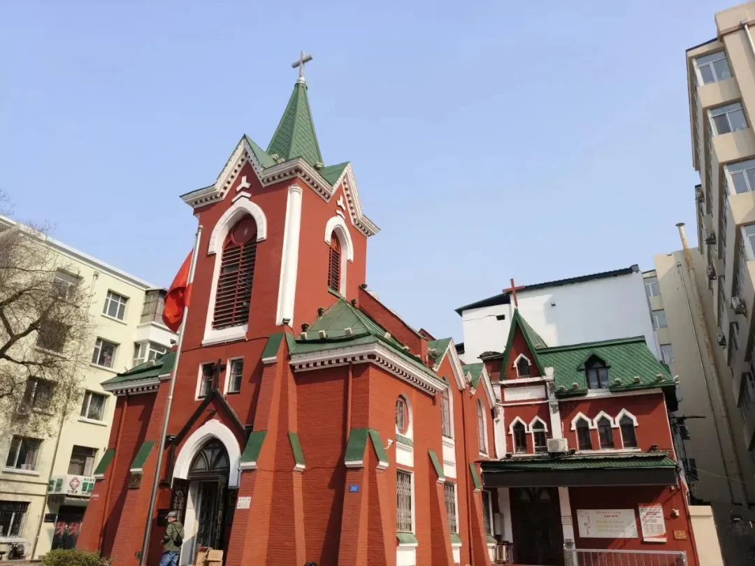 这座教堂建成于1916年,又称“尼埃拉依教堂”,建筑师为弗奥罗布,是典型的哥特式建筑风格,砖木结构,原为基督教德国路德会教堂。平面呈十字形,主入口是一扇雕花大门,教堂的外形朴实无华,极少雕饰物,整个教堂突出了哥特式建筑的尖拱屋顶和小窗,绿色的屋顶与红色的主体相互碰撞,显得格外夺目。