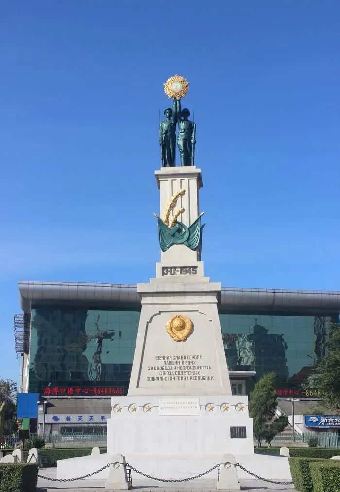 纪念碑位于哈尔滨市南岗区博物馆广场,是省级文物保护单位。1945年11月,为纪念对日战争中英勇牺牲的苏军官兵而建立。纪念碑高34米,分为基座、底座、主塔、塔身、铜像五部分。碑顶铜像由高3.5米的苏联水兵和陆军战士形象并立组成,昂首伫立,高举苏联国徽,象征胜利。塔身镶嵌着铜铸的红旗和党徽,塔体浮雕重现了苏联红军对日作战的场景。基座正面是俄文和中文雕刻的碑文:“为中国的自由与独立,在解放东北作战中牺牲的苏军英雄们永垂不朽!”