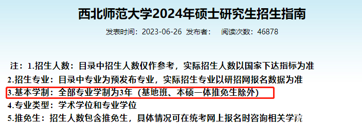 西北师范大学发布2024年硕士研究生招生指南中提到,“全部专业学制为3年(基地班、本硕一体推免生除外)”。