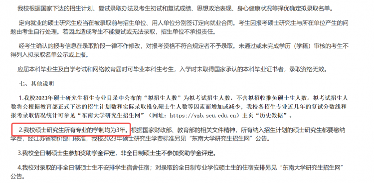 东南大学在《2023年硕士研究生招生工作章程》中表明,学校硕士研究生所有专业的学制均为3年。