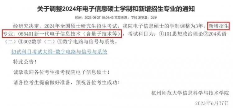 6月27日,杭州师范大学发布通知指出,信息科学与技术学院的电子信息硕士的学制调整为3年。