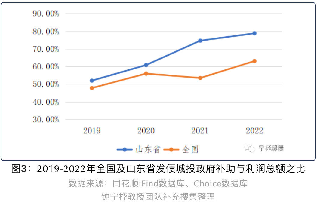 2019年到2022年,山东省城投公司政府补助收入占利润总额的比重从51.95%上升至78.77%,全国同期这一指标从47.73%上升至63.07%。