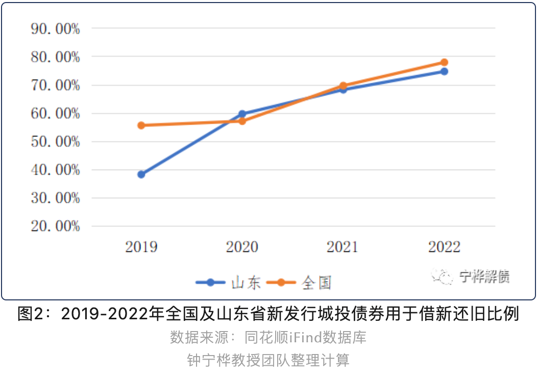 2019年到2022年,山东省新发行的城投债券中,用于借新还旧的比例从38.16%上升至74.6%。全国同期城投债券用于借新还旧的比例从55.51%上升至77.83%。