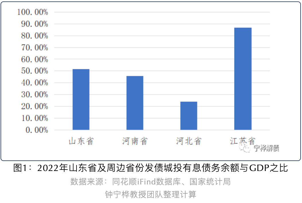 截至2022年,山东省发债城投的有息债务余额超过4.5万亿元,为45169亿元,位列全国第四。从相对规模来看,山东省发债城投的有息债务余额与地区GDP之比约为51.66%,低于江苏省而高于其他周边省份。