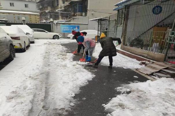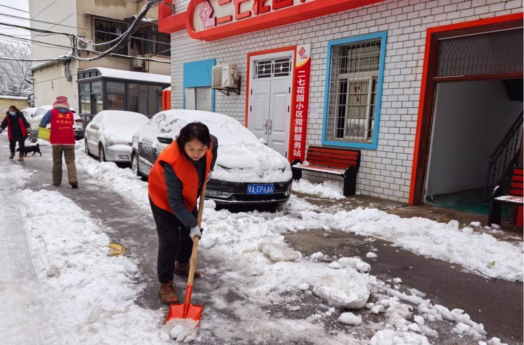 小区守护“她”力量,巾帼助力显担当。在社区妇联支持下,二七花园小区“邻里守望”妇女小组成员们充分发挥自身优势,带动小区热爱公益事业、责任心强的妇女姐妹,自发组成治安巡逻志愿服务队。每天晚上7点,她们准时集中在小区门口,统一身穿红色小马甲,开始在小区进行治安巡逻,温馨提醒居民关好门窗、水、电和煤气,注意防火、防盗、防诈骗,做好安全隐患排查工作,受到居民一致好评。在今年2月的冻雨大雪中,妇女小组组长池霞珍下楼巡逻时看到门卫胡师傅和一名党员在用铁锹铲除积雪。平时就热心社区公益事业的她,立马借来铁锹铲起了雪。铲雪间隙,她用手机录下了胡师傅铲雪这一温馨画面,随后发在了小区居民微信群里,引发了小区居民的积极响应,纷纷加入铲雪除障行动,形成了小区事务人人有责、人人参与的良好氛围,得到了居民的纷纷点赞。