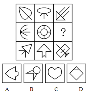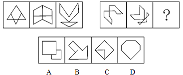 解析:本题考查图形的轴对称。九宫格的图形推理题,每幅图都是轴对称图形,并且对称轴方向各不相同,对称轴连接之后,构成一个“米”字形,因此问号处补充的图形,应该是一个横轴对称图形,因此,本题答案为A选项。