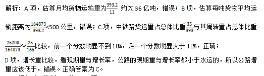 解析:判断比重变化,只要判断部分与整体增长率即可,部分增长率>整体增长率,比重超过上年。2014年11月货物运输总量的整体增长率为7.1%,增长率大于7.1%的为公路的8.6%和水运的7.6%。正确答案为D。
