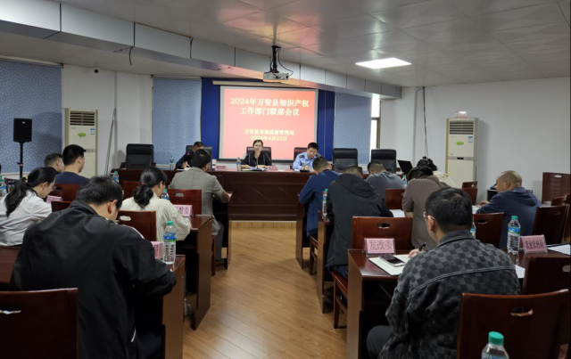4月23日上午,组织召开2024年知识产权工作部门联席会议,万安县人民政府副县长周晶晶出席会议并作讲话,万安县市场监管局一级主任科员梁法桂对全县2023年以来知识产权工作情况进行了总结。周晶晶指出,一是要高度重视,充分认识知识产权保护工作的重要性和紧迫性,进一步凝聚共识。二是要加压奋进,要以知识产权强县建设工作助力产业高质量发展、助力营商环境持续优化。三是要完善部门协作,持续构建知识产权大保护工作格局,提升知识产权全链条保护水平。四是要加快推进园区企业专利转化运用,促进创新成果向现实生产力转化,为发展新质生产力赋能。