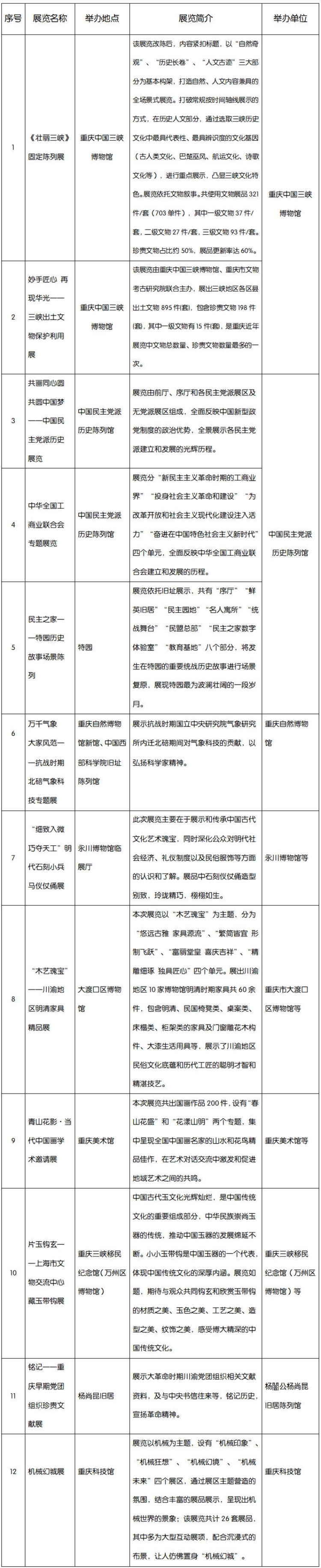 重庆历史源远流长,文化底蕴深厚,巴渝文化、三峡文化、抗战文化、革命文化、统战文化、移民文化在此交相辉映。我市各个博物馆、美术馆、文化馆精心设计推出了三峡出土文物保护利用展、明代石刻小兵马仪仗俑展等特色展览80余场,同时融入网红打卡地、演艺、重庆好礼、赏花游园、旅游专线、特色活动等丰富元素,供市民游客进行文博和休闲深度体验。
