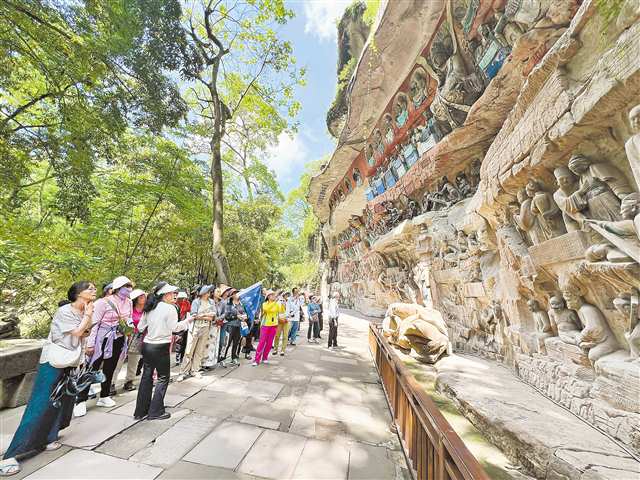 4月28日,大足区宝顶山石刻景区游人如织。“五一”假期临近,许多景区已经迎来了客流小高峰。通讯员 张玮 摄/视觉重庆