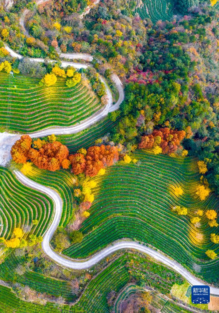 湖北省十堰市武当山旅游经济特区八仙观村的茶园色彩斑斓(11月24日摄,无人机照片)。