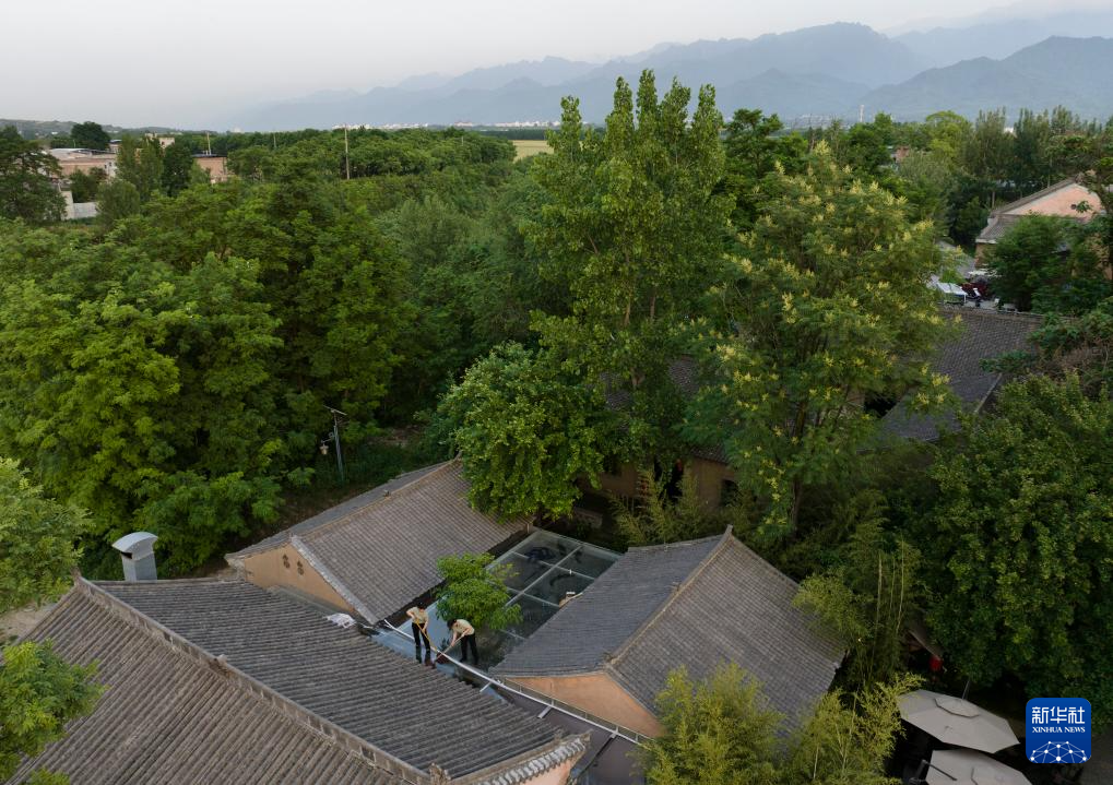 5月15日,在西安市长安区“长安唐村”景区一家民宿内,村民在打扫卫生(无人机照片)。