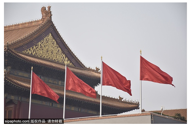 天安门广场国旗升降时刻分别是在天安门广场看到太阳升起和落下的时刻,寓意伟大祖国与日同辉、繁荣昌盛。