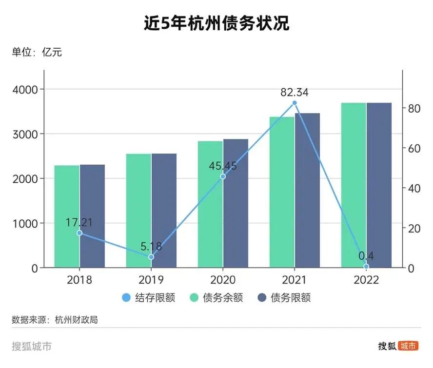 从上图可以看出,杭州“贴边”举债几乎是常规操作:近5年杭州债务结存限额均较低,2021年稍高,但也不超过100亿。