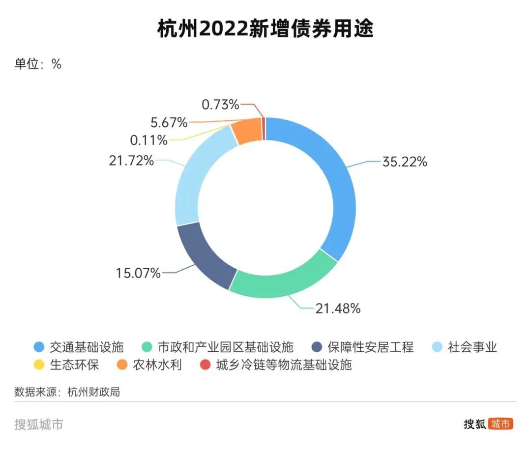 根据杭州财政局披露,2022年全市新增地方政府债券中,35.22%用于交通基础设施建设,21.48%用于市政和产业园区基础设施,两项之和占比过半。