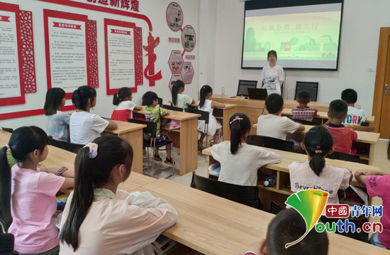 研支团团长许一旦为孩子们讲解垃圾分类知识。扬州大学研支团供图