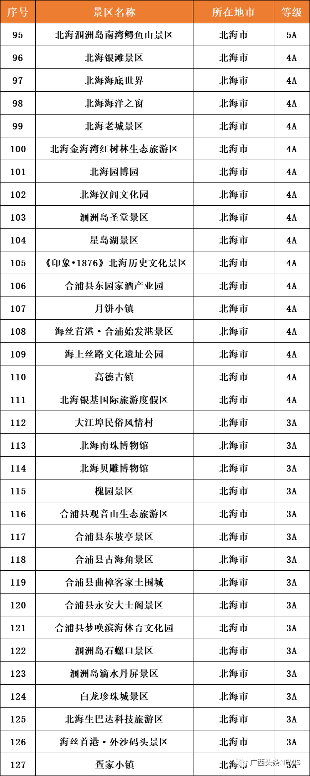 广西文化和旅游厅网站11日发布《广西2021年A级旅游景区名录表》,截至2021年底,广西共有A级旅游景区661个,其中5A景区8个,4A景区307个,3A景区335个,2A景区11个。