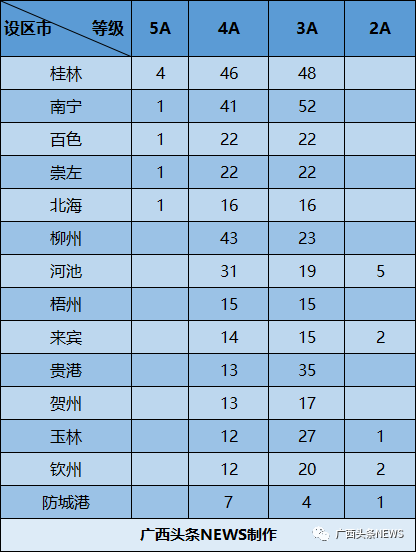 记者梳理发现,目前广西有8个5A级旅游景区,分布在桂林市、南宁市、百色市、崇左市和北海市,其中桂林市4个。