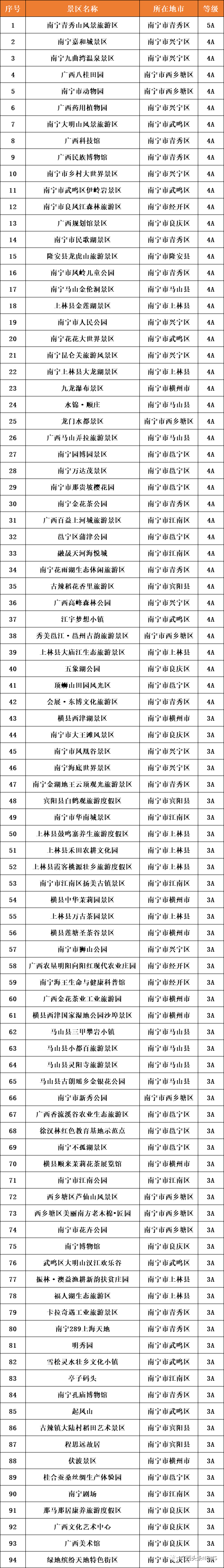 A级旅游景区数量最多的前五个市依次是:桂林市98个、南宁市94个、柳州市66个,河池市55个,贵港市48个。