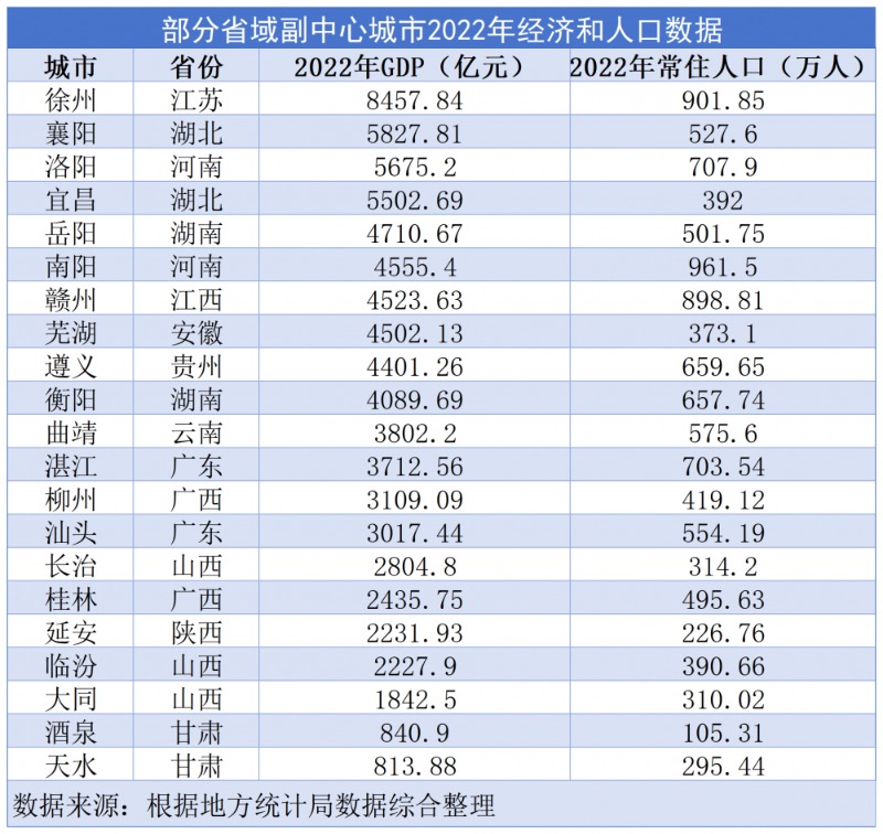 秦尊文认为,目前全国省域副中心城市中建设相对成熟的有襄阳、宜昌、洛阳、南阳、赣州、徐州、湛江、岳阳、衡阳。这些城市的共同特征是经济、人口等综合性指标体量较大。比如湖北的襄阳和宜昌、河南的洛阳和南阳,GDP仅次于省会,已经具备一定的经济实力,能够带动周边地区发展。同时,这些城市城区人口较多,在现阶段人口加速向省会城市聚集的背景下,这些省域副中心城市起到了分流的作用,能够遏制人口过快过多向省会聚集所带来的隐患。