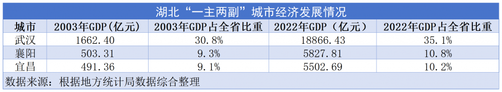 目前看来,湖北“一主两副”重点发展战略成绩斐然。在湖北发文确立“一主两副”格局的2003年,武汉、襄阳、宜昌三市的GDP占全省比重为49.2%;到2022年,三市GDP占全省的比重已经提升至56.1%。