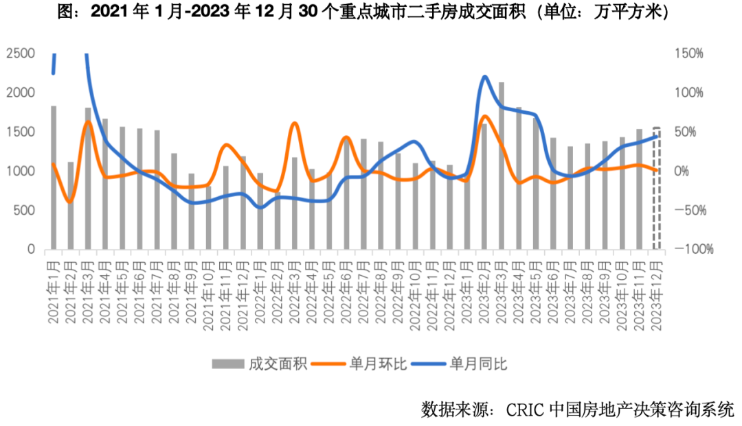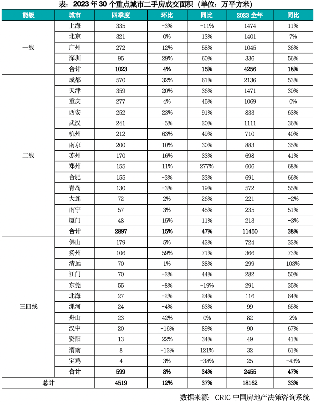 2023年,30个重点监测城市二手房全年累计成交面积18162万平方米,同比增长33%。四季度,30城二手房总成交面积约为4519万平方米,环比增长12%,同比增长37%。