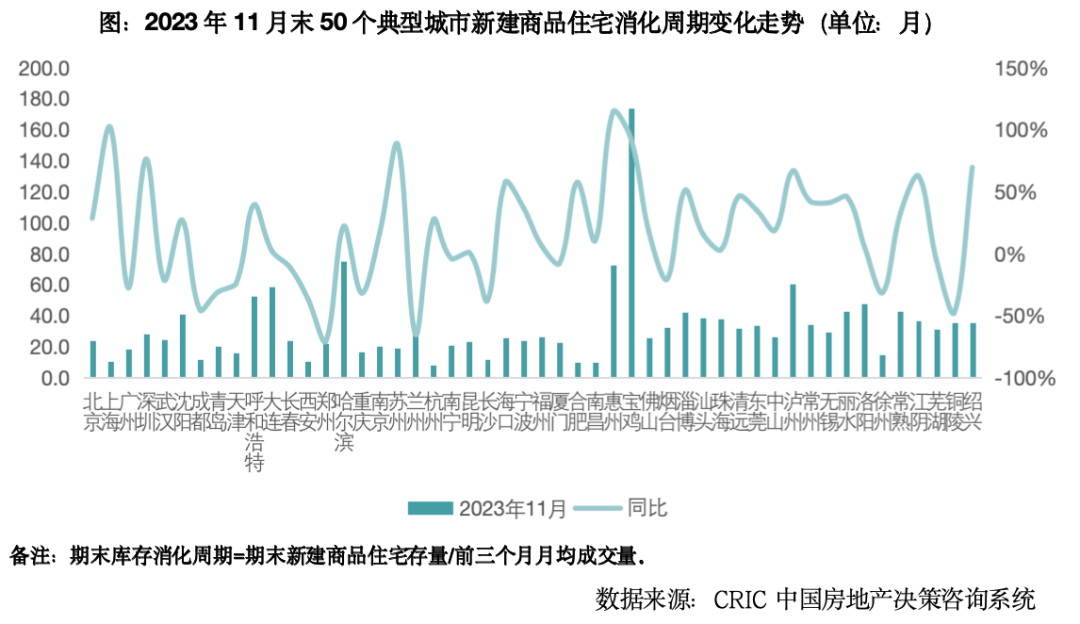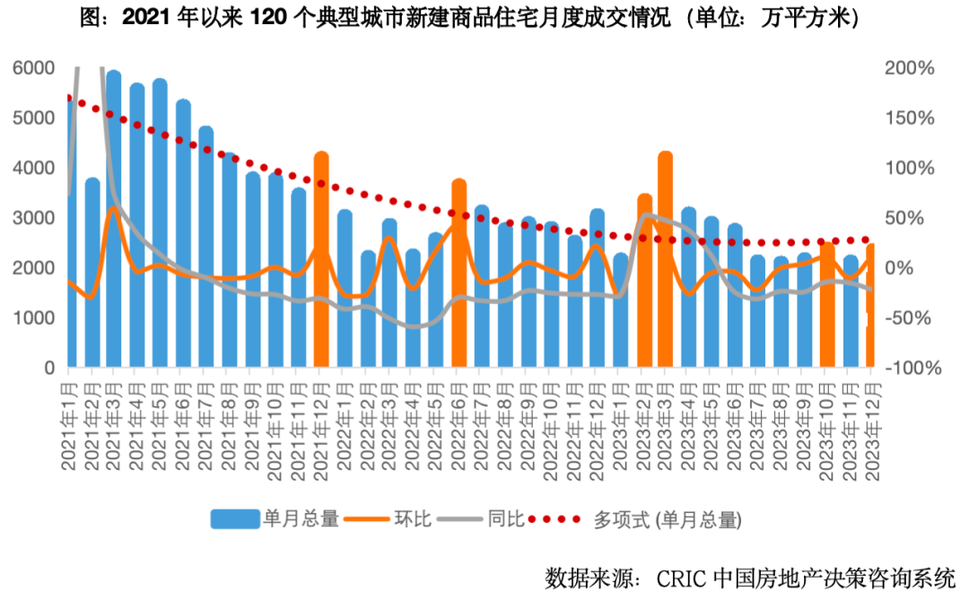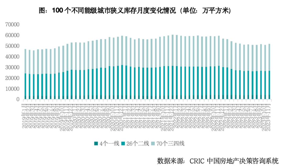 2023年狭义库存持续回落,四季度小幅微增但仍为阶段性底部。据CRIC监测数据,2023年11月末百城商品住宅库存量达到了51852万平方米,环比微增2%,同比下降13%。