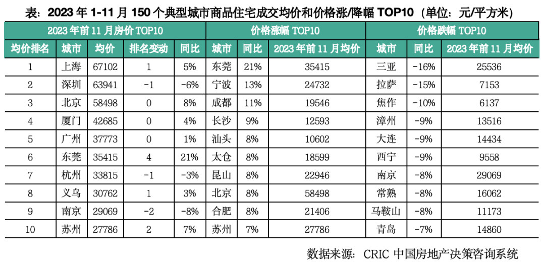 具体来看,一线及长、珠三角城市占据房价高点。如上海前11月商品住宅成交均价超过6万元/平方米,同比上涨5%。其次如北京、厦门、东莞、义乌、苏州等居民改善需求依旧旺盛的城市,房价同比均有不同幅度上涨。而深圳、杭州、南京等受推盘结构和成交转淡等影响,房价下跌。