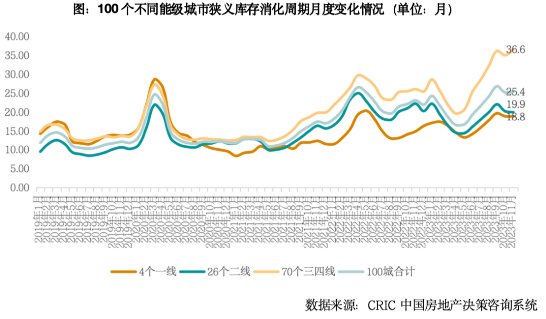 从去化周期变动来看,以4月和9月为转折点,4月由降转增,而9月则由增转降并持稳,至11月末达25.4个月,环比微增1%,同比上涨10%。一线持平18.8个月,二三线环比持降,三四线保持增势。目前三四线去化周期已突破36个月,创2019年以来新高,去化风险显现。