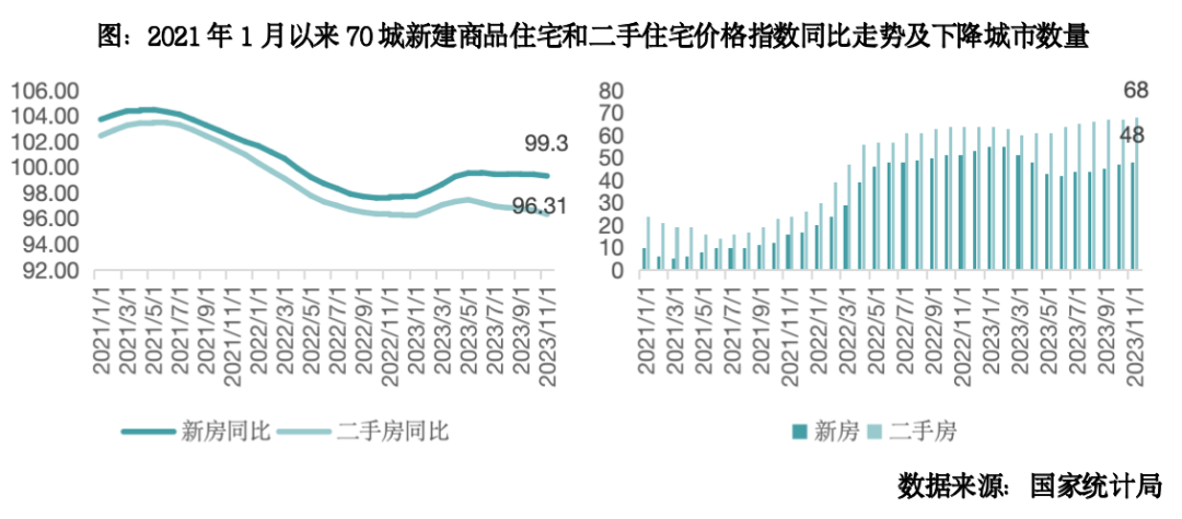 从全国层面来看,从国家统计局公布的70个大中城市房价变动情况来看,2022年开始新建商品住宅和二手住宅销售价格同比和环比均进入下降通道,2023年1-5月,价格有所反弹,但6月以来,又重回下行区间,11月依然同环比齐跌。