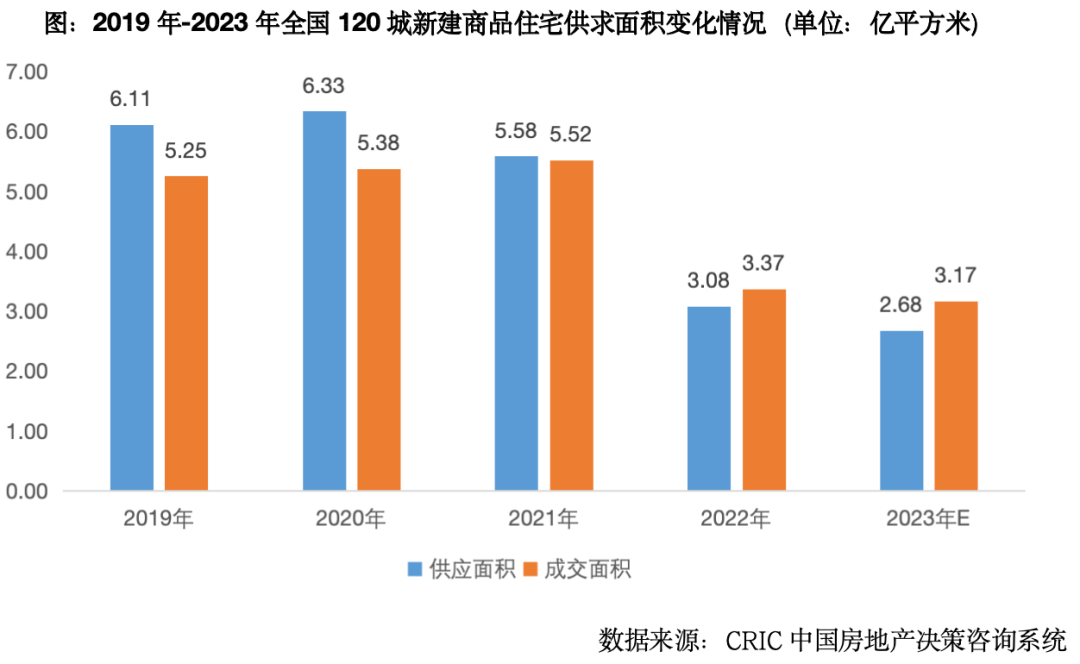 纵观近年来120个重点城市楼市成交变化,2019-2021年一直保持着高位微增走势,2021年下半年以来行情开始“急转直下”,低迷走势延续至2022年,步入2023年以来,虽然也迎来两轮脉冲式复苏,但整体回暖持续性不足,延续筑底:预估全年新房供应预计为2.68亿平方米,同比下降13%,成交预计为3.17亿平方米,同比下降6%,供求比由2022年的0.91降至仅为0.84,供给约束愈发明显。