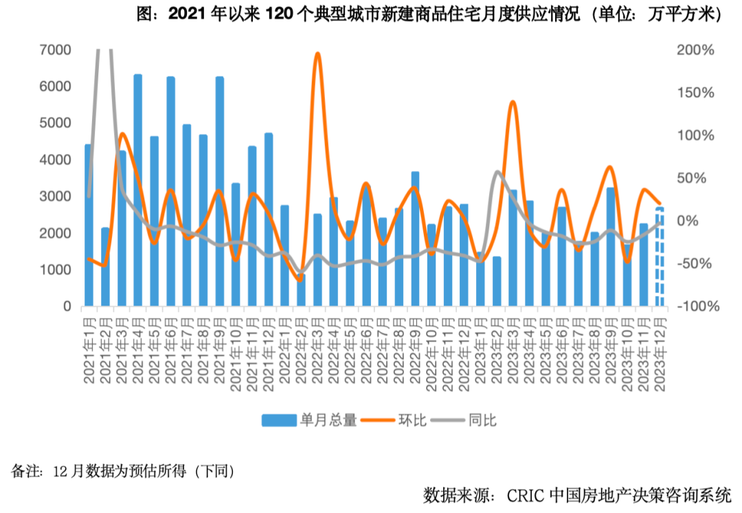 据CRIC统计,2023年前11月全国120个重点城市商品住宅新增供应面积24123万平方米,同比下降14%。即便12月迎来“翘尾”行情,全年新房供应规模预期仍将缩减至近五年低点,主要受到新房低迷行情和地市显著缩量的双重影响。从月度表现来看,仅3月和9月单月供应量超过3000万平方米,余下多数月份均在2000万平方米左右波动,供给约束愈发显著。