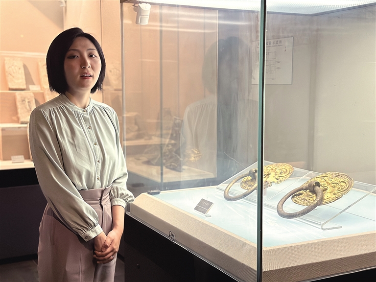 5月16日,西安博物院业务研究(编辑)部助理馆员王璐介绍鎏金铜铺首。 记者 陈志涛摄