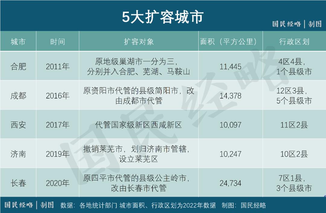 以合肥与芜湖、马鞍山三分巢湖为起点,成都代管简阳、西安代管西咸新区、济南合并莱芜、长春代管公主岭,5大省会先后完成了外延式扩张。