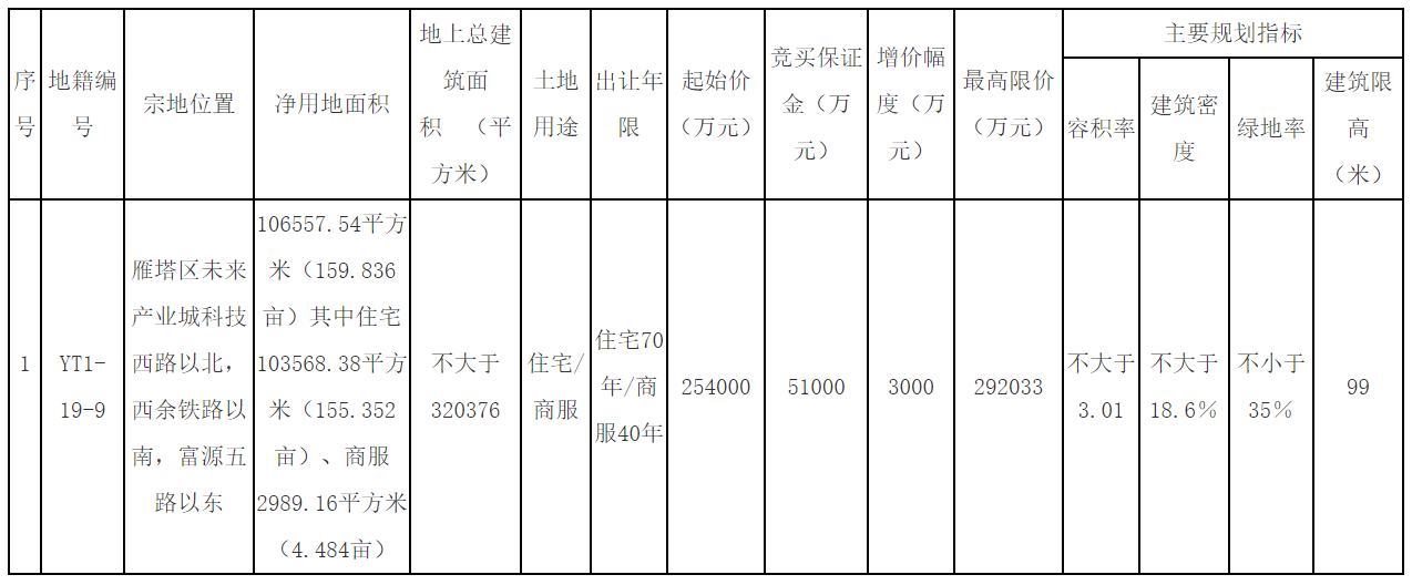 地籍编号YT1-19-9,地块位于雁塔区未来产业城科技西路以北,西余铁路以南,富源五路以东,净用地面积106557.54平方米(159.836亩)其中住宅103568.38平方米(155.352亩)、商服2989.16平方米(4.484亩),容积率不大于3.01,建筑密度不大于18.6%,绿地率不小于35%。