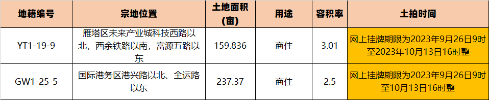 国际港务区、雁塔区未来产业城2宗397亩商住用地10月13日挂牌截止。