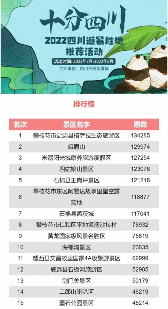 截至2022年8月17日24时,由近百万网友踊跃参与的“十分四川”2022四川避暑胜地推荐活动点赞环节火爆收官!