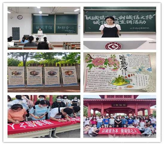 ——打造诚信教育、感恩教育和责任教育专题教育品牌。该院分别邀请宝鸡市公安局警官、宝鸡市中国银行经理为全院学生作《常见电信网络诈骗警情及防范》和《个人理财与征信知识》专题报告,普及个人理财、征信、金融、网络安全等相关知识,并组织学生现场诚信签名。广泛宣传国家助学贷款等资助政策,组织生源地信用助学贷款毕业生还款政策宣讲,发放《致2022届高校生源地信用助学贷款毕业生的一封信》,签订生源地信用助学贷款还款承诺书。以党史学习教育为契机,开展诚实守信先进模范图片展,弘扬崇德向善的良好品质。