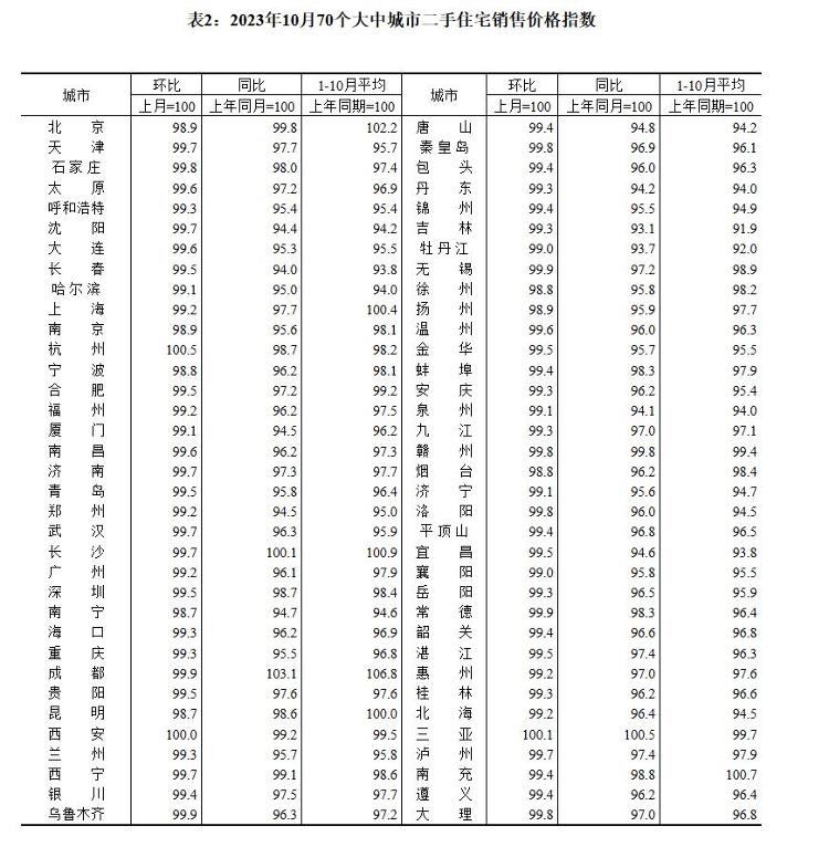 表2:2023年10月70个大中城市二手住宅销售价格指数