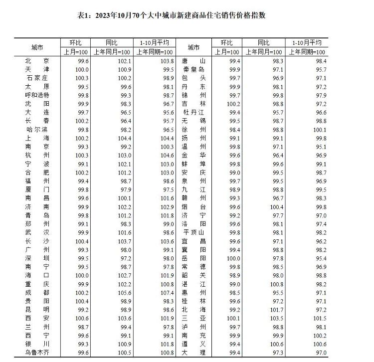 表1:2023年10月70个大中城市新建商品住宅销售价格指数