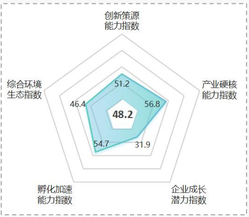 总体来看,长沙未来产业潜力综合指数得分48.2,排名位列第16位,比GDP排位(第15位)低一位,未来产业发展潜力与综合实力基本相当。五个分指数中,产业硬核能力、孵化加速能力、创新策源能力得分均在50分以上,排名在前15位,而综合环境生态、企业成长潜力得分和排名相对较低。