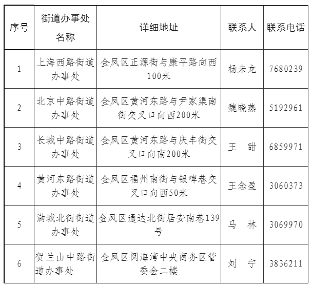 公开招聘人员(含单列招聘人员)在金凤区辖区就近的街道办事处报名;定向选聘人员在现(原)工作所属的街道办事处报名,现(原)良田镇报考人员在黄河东路街道办事处报名,现(原)丰登镇报考人员在贺兰山中路街道办事处报名,曾经在兴庆区、西夏区担任过社区工作者的人员在金凤区辖区就近的街道办事处报名)。报名地址信息如下: